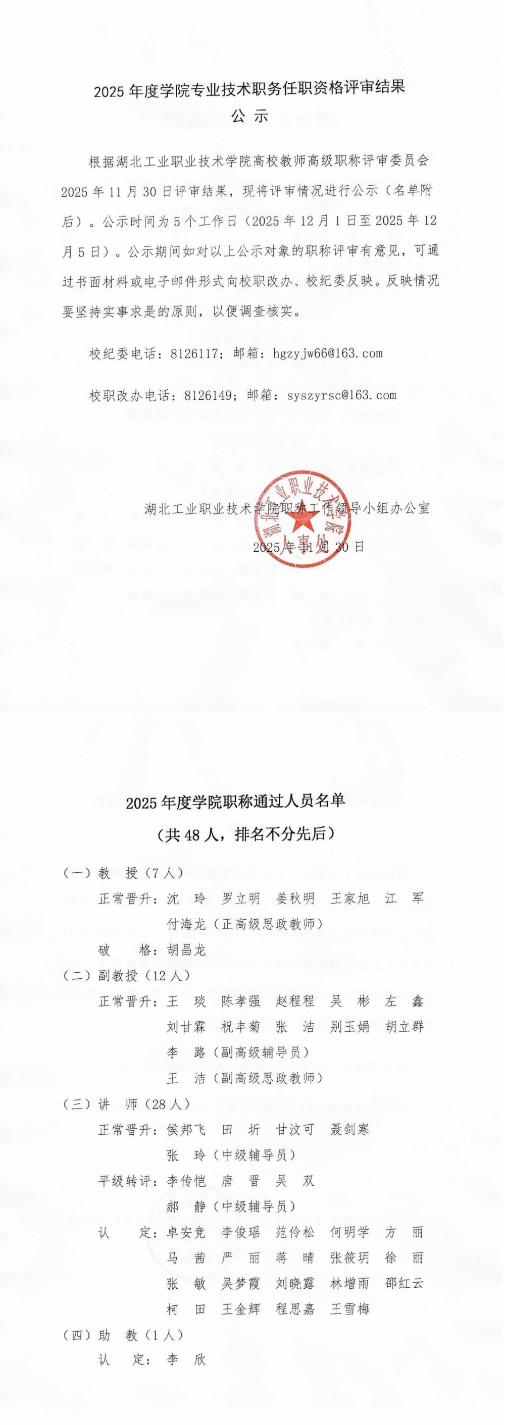 2025年度学院专业技术职务任职资格评审结果公示